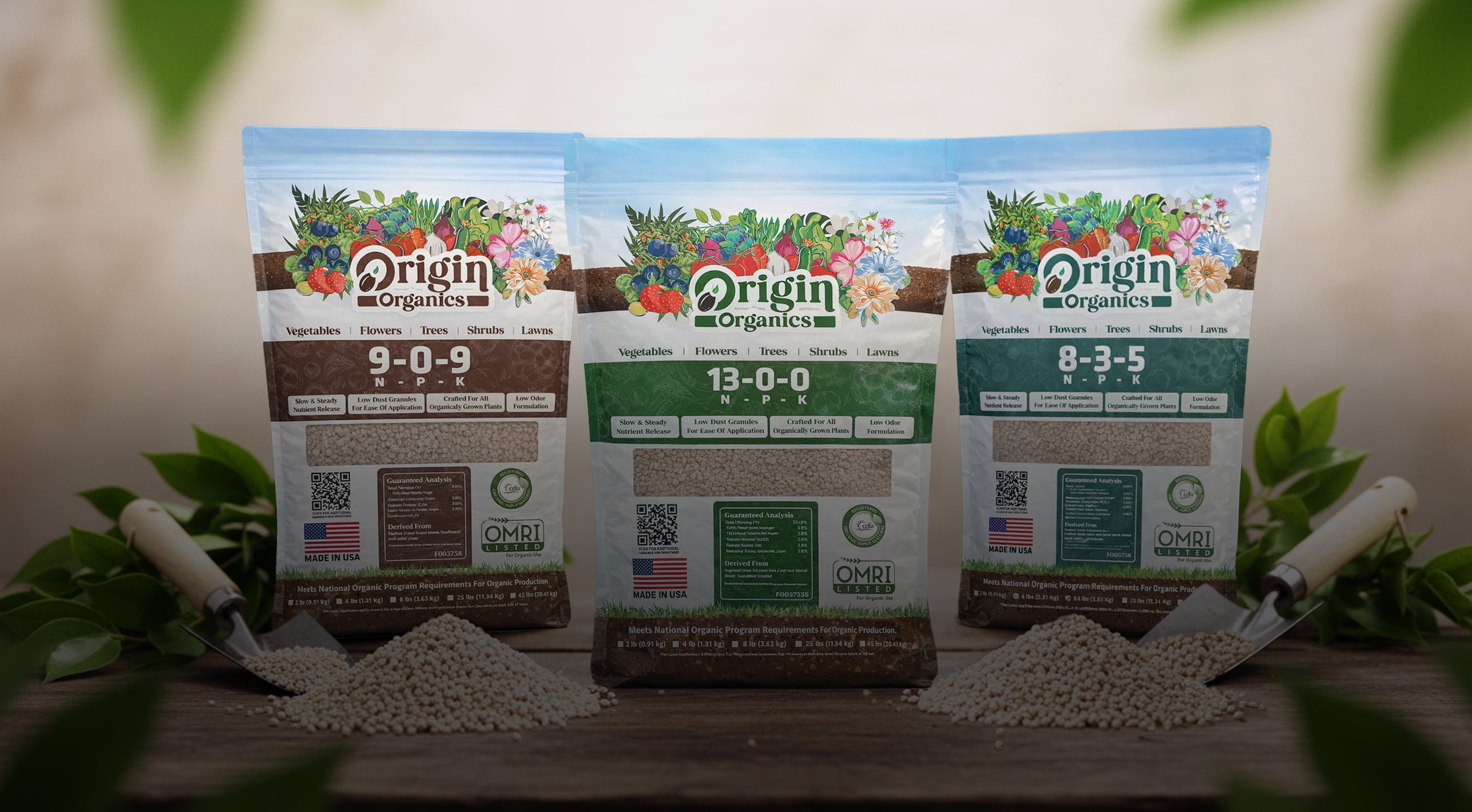 Origin organic fertilizers are scientifically formulated and rigorously tested for effective performance in organic gardening. OMRI Listed and CDFA approved, these granular products provide proven steady-release nutrients that support steady plant growth, enhance soil microbial activity, and improve overall soil health.